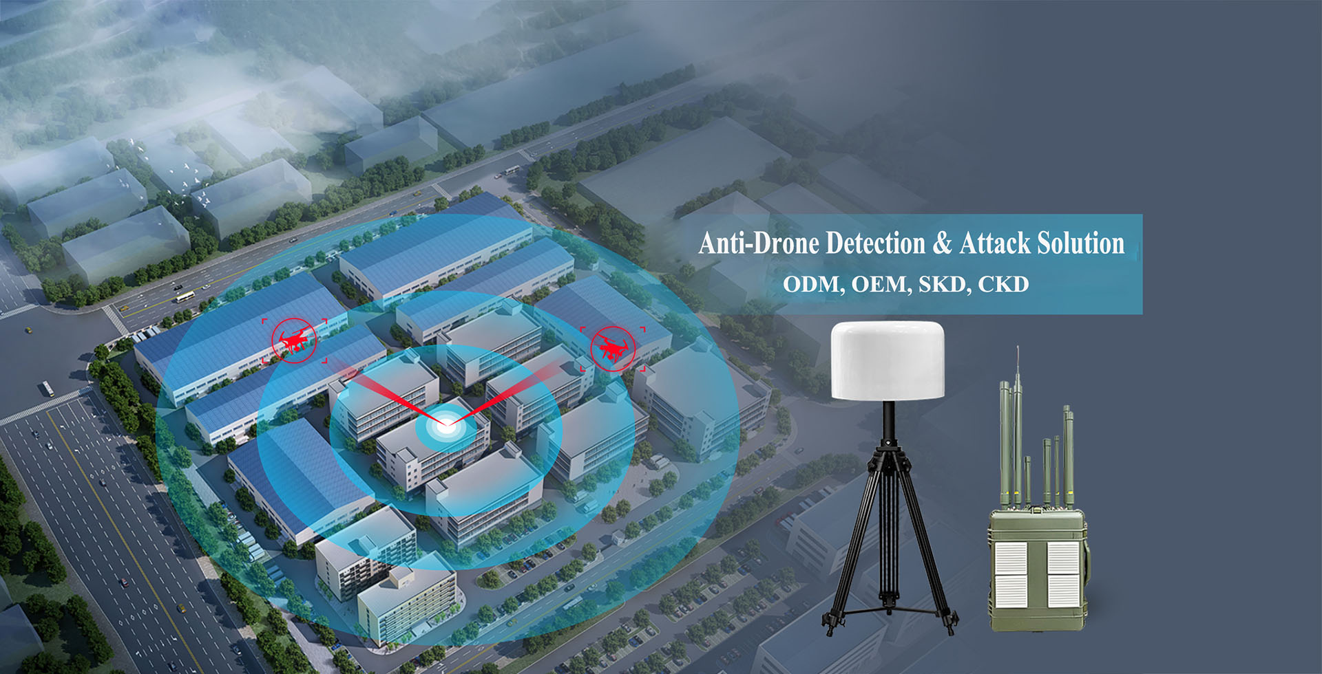 The device adopts a portable design and can be operated by a single person. It can be quickly deployed to power plant, chemical plant, military locations, aviation airports, prison guards, event sites, etc.