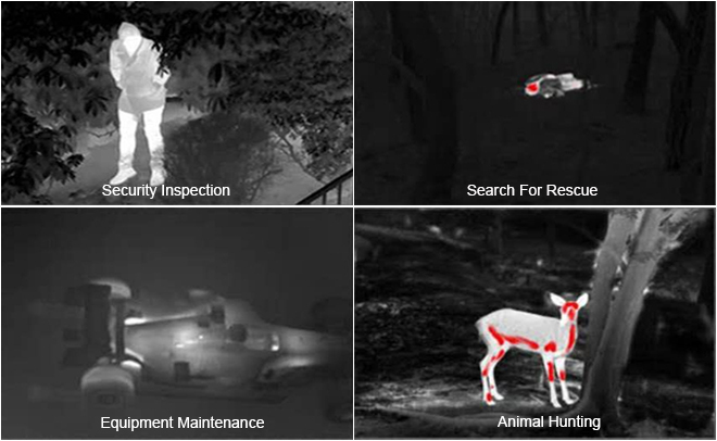 Helmet mounted thermal imager has various color palettes such as black-hot, white-hot, target highlight, that can be used for outdoor night vision, hunting, rescue and enforcement. For outdoor night vision, it can see the animals in darkness, fog, rain, and even other harsh conditions. For hunting, it can help recognize, identify, and locate the target in different environments by various color palettes and modes. For rescue and enforcement, it is light and small to be mounted on the helmet for long time, freeing your hands to rescue and enforce, while multiple display modes improve searching efficiency.